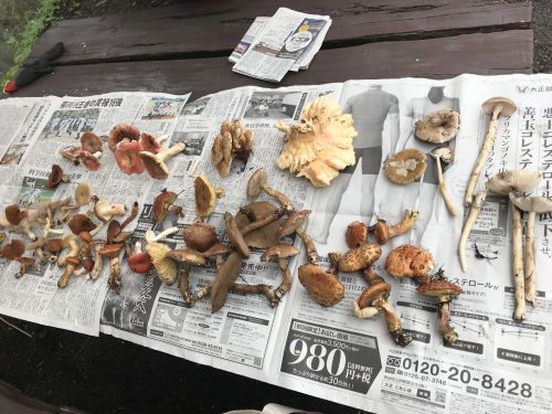 | 東富士山荘のおばちゃんに鑑定依頼。 右端がドクツルタケ、真ん中上がマスタケ。 他は食べられます。 |