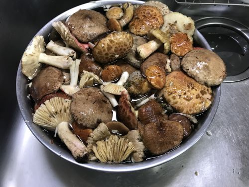 | 家に帰って、50度のお湯で数分漬ける。 その後水洗い。 これが山荘のおばちゃんのお勧めキノコ処理方法。 |